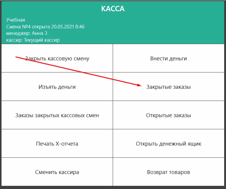 Во вкладке Закрытые заказы отображаются все заказы, которые были закрыты за текущую смену. Найдите в списке заказ, который нужно вернуть.