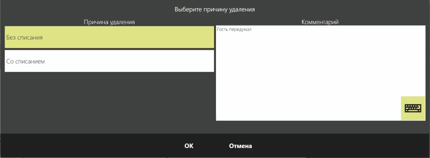 В открывшемся меню выберите причину удаления заказа и оставьте комментарий.
