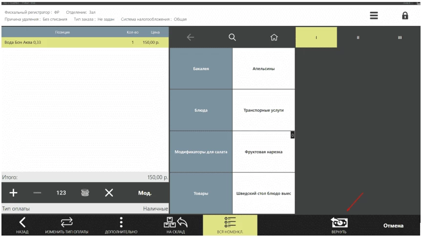 Для примера возьмем ситуацию, когда гостю возвращается сумма по чеку без возврата товара на склад.