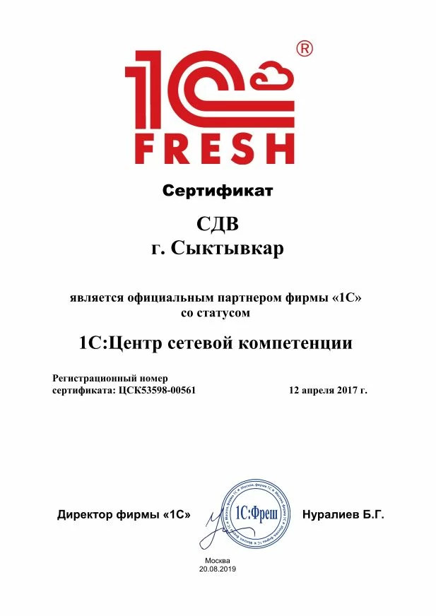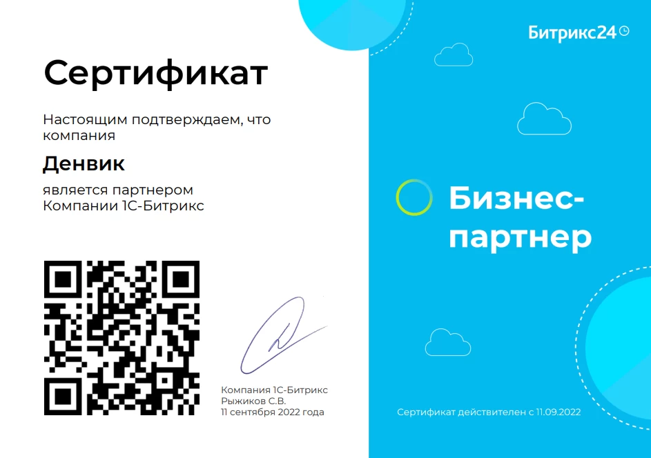 Сертификат подтверждает, что компания Денвик является Бизнес-партнером компании 1С-Битрикс