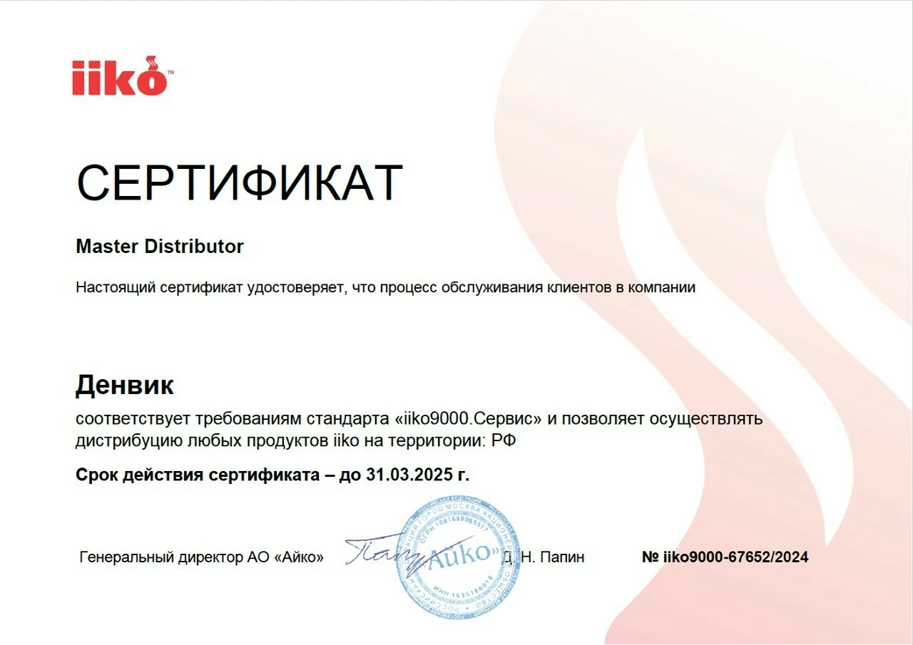 - IIKO 9000 сервис. Подтвердили свои знания и опыт максимальным уровнем сертификации IIKO. Специализируемся на внедрении и обслуживании iiko по всей России.